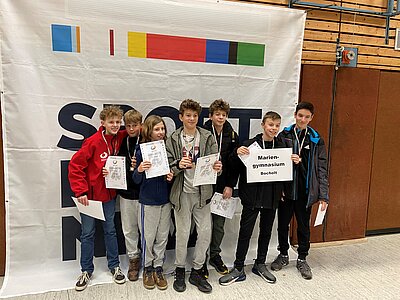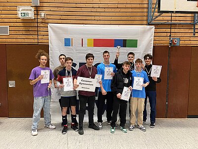 In der WK II machten die Teams vom Titelverteidiger Carl-Humann-Gymnasium Essen und vom Freiherr-vom-Stein-Gymnasium Münster mit ihren souveränen Auftaktsiegen gegen das Cusanus-Gymnasium Erkelenz bzw. das Dietrich-Bonhoeffer-Gymnasium Neunkirchen schnell deutlich, dass der Turniersieg nur über sie laufen würde - ein Eindruck, der sich in den nachfolgenden Spielen gegen das Friedrich-Bährens-Gymnasium Schwerte bzw. das Max-Planck-Gymnasium Bielefeld bestätigte. Das Finale zwischen diesen beiden Mannschaften war dann an Spannung und Intensität kaum zu überbieten. Am Ende setzten sich die Münsteraner in zwei Sätzen gegen die Essener durch und feierten lautstark ihr Ticket nach Berlin! Herzlichen Glückwunsch an beide Teams für die tolle Leistung!