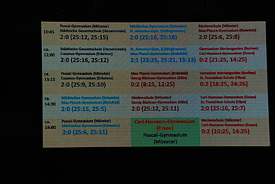In der zweiten Gruppe der WK III war es ebenfalls spannend. Hier gewann die Marienschule Münster gegen das Max-Planck-Gymnasium Bielefeld souverän 2:0, ebenso das Georg-Büchner-Gymnasium Köln, so dass es hier zu einem entscheidenden Spiel über den Finaleinzug kam, das die Münsteranerinnen mit 25:12 und 25:11 gewinnen und somit ins Finale einziehen konnten.