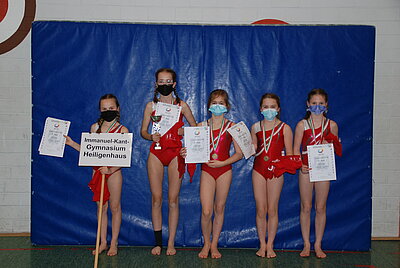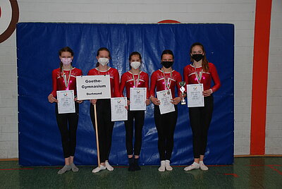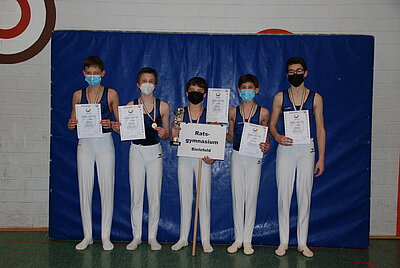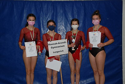 Die Freude wieder eine Landesmeisterschaft turnen zu können, war auch hier allen Beteiligten anzumerken. So hatte es sich auch die Jungenmannschaft des Ratsgymnasiums Bielefeld trotz der weiten Anreise nicht nehmen lassen zu kommen, obwohl keine weitere Jungenmannschaft angetreten war und ihr Landessieg somit ohnehin feststand. Auch das Immanuel-Kant-Gymnasium aus Dortmund reiste in der WK II an, obwohl es nur über 3 gesunde Turnerinnen verfügte. Diese Teilnahme hatte sich jedoch gelohnt, sprang am Ende doch mit 139,30 Punkten der Landesmeistertitel heraus - herzlichen Glückwunsch zu dieser tollen Leistung, zumal das Erreichen des 1. Platzes kein Selbstläufer war und alle Teams sehr eng beieinander lagen. So trennten nur 2 Punkte die zweitplatzierte Mannschaft, das Hannah-Arendt-Gymnasium aus Lengerich (137,30 Punkte), vom 1. Platz und nur 3,45 Punkte vom drittplatzierten Gymnasium Schloss Neuhaus aus Paderborn (133,85 Punkte), dicht gefolgt vom St. Adelheid-Gymnasium Bonn (129,75 Punkte) und dem Immanuel-Kant-Gymnasium aus Heiligenhaus (127,55 Punkte).